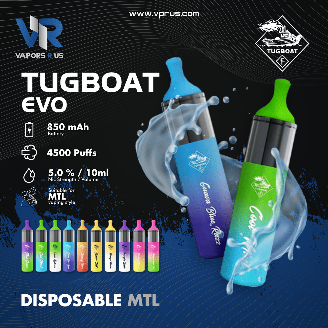 Tugboat EVO Disposable runs on an 850mAh internal battery, resulting in improved performance at both lifespan and stability. Packed with a 10ml capacity for e-juice, it’s entirely down to your preference to choose the sweet flavour. Using a 5% nicotine level, it is absolutely able to bring you a good throat hit and immerse cloud, satisfying you up to 4500 puffs. No maintenance, no chargement. Depending on your inhabit, you can adjust the airflow, coupled with 1.2ohm built-in coil, you can take sufficient atomization on the exhale.